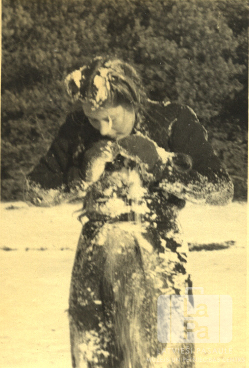 Dzidra Jansone (pr. Šmita), viscaur noklāta ar sniegu, stāv sniegā Volterdingenē (angļu zonā). Par šo gadījumu Dzidra Jansone-Šmita atceras: "Mums, jauniešiem, bija bezrūpīga dzīve DP nometnēs."