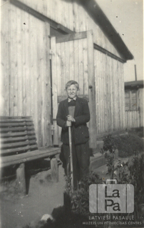 Ēriks Dzenis vienpadsmit gadu vecumā ar nūju rokās stāv pie koka barakas Valkas nometnē Nirnbergā (amerikāņu zonā). Kreisajā pusē koka sols, priekšplānā puķu dobe.