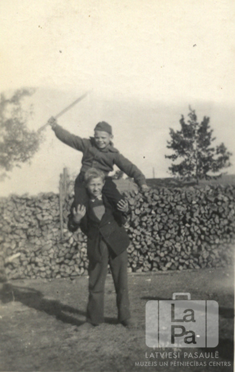 Divi zēni pie sakrāmētas malkas kaudzes Valkas nometnē Nirnbergā (amerikāņu zonā). Viens zēns ir uzkāpis otram zēnam uz pleciem un tur nūju rokās. Augšā: Varimonts Benders. Apakšā: Ēriks Dzenis.