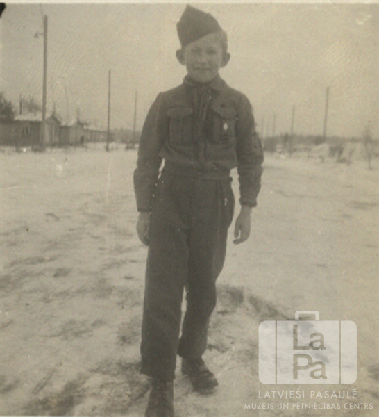 Mazskauts Ēriks Dzenis formastērpā uz apsnigušas ielas Valkas nometnē Nirnbergā (amerikāņu zonā).