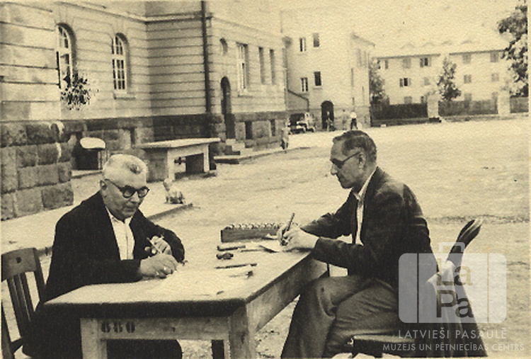 Divi vīrieši sēž pie galda Ulmas nometnes pārtikas sadales punktā (amerikāņu zonā). Uz galda atrodas skaitļošanas ierīce. Blakus vairākas ēkas. Otrais no kreisās: Kārlis Dzenis.