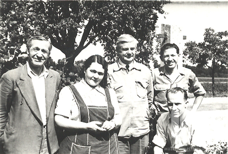 Četri vīrieši un sieviete – pārtikas sadales punkta darbinieki Ulmas nometnē (amerikāņu zonā). Pirmais no kreisās: Kārlis Dzenis.