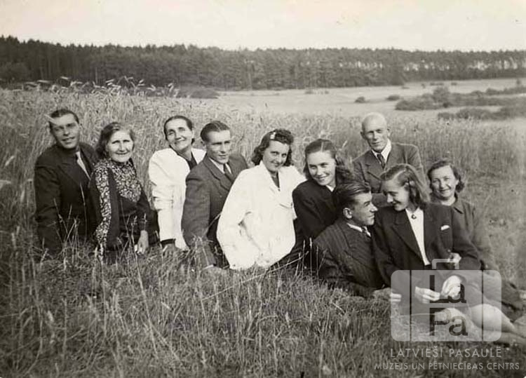 Cilvēku grupa no Pegnicas nometnes (amerikāņu zonā) sēž Bavārijas rudzu lauka malā Ģībiešu ģimenes kāzu laikā. Fonā meža mala. Priekšā, no kreisās: ? Dīķerts, ? Dīķerta, nezināms, ? Lūse, ? Lūsis, nezināms, nezināms, ? Ģībietis, ? Ģībiete.