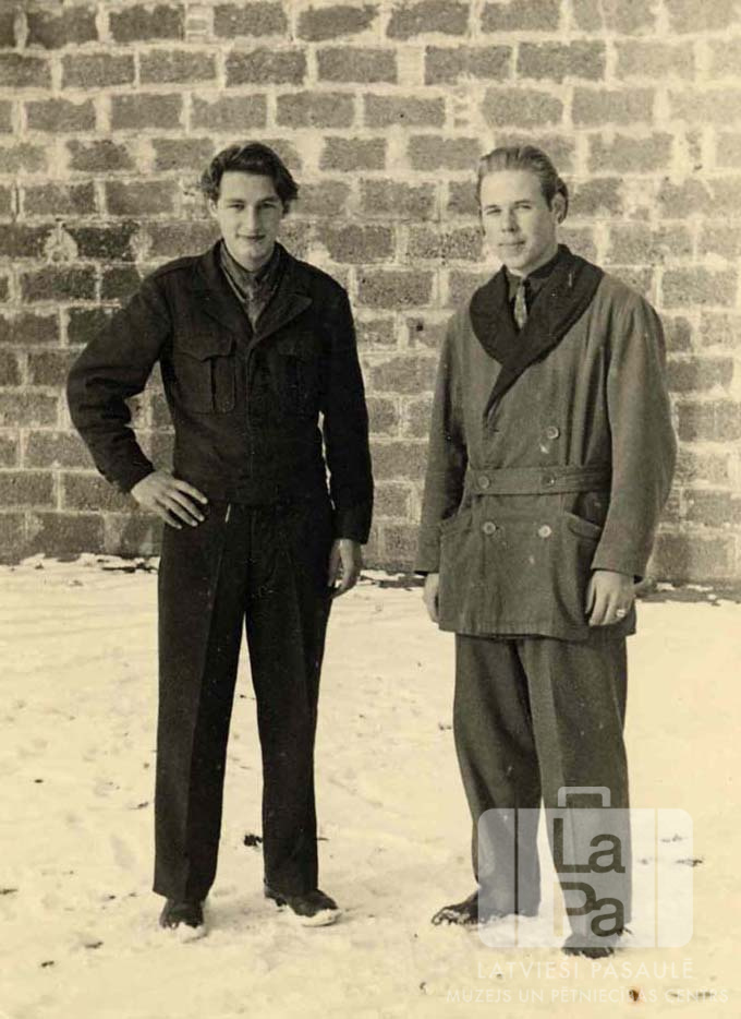 Divi jauni vīrieši stāv sniegā pie mūra sienas ziemas laikā Pegnicas nometnē (amerikāņu zonā). No kreisās: Harijs Lūsis, Imants Niedrīte.