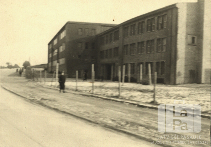 Lidmašīnu fabrika Švarcenbekā (angļu zonā), kurā sākumā tika ievietotas pārvietotās personas. Vairākstāvu ēkas priekšā gar ielu pastaigājas cilvēki.