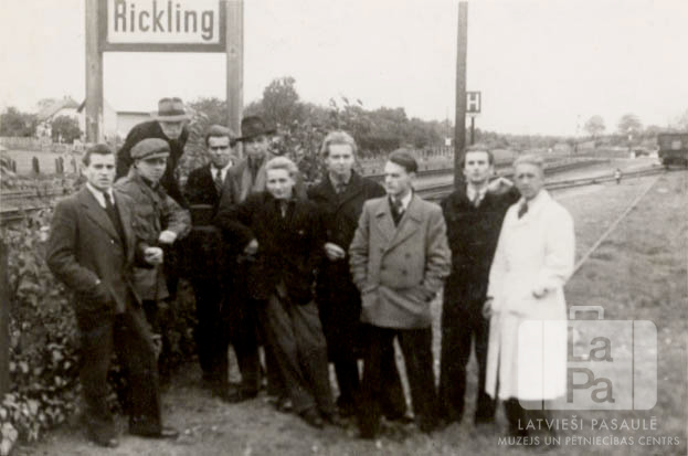 Desmit vīriešu grupa no Lauksaimniecības skolas Alterfrādē (angļu zonā) savā pēdējā braucienā stāv pie zīmes blakus dzelzceļa sliedēm. Uz zīmes ir rakstīts "Rickling". Otrais no kreisās: Indulis Liepiņš. Grupā vēl redzami: Imants Sulainis, Arnis Abermanis.