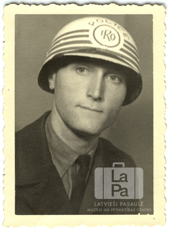 Jānis Tumuls – policists Centrālajā nometnē Vircburgā (amerikāņu zonā). Vīrietis uzvalkā un ķiverē, uz kuras ir rakstīts "POLICE/ IRO".