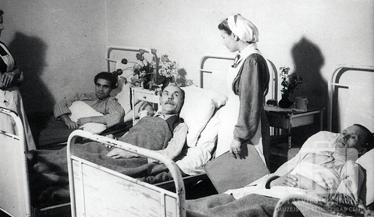 Palāta ar slimniekiem un medmāsām Saules nometnes slimnīcā Gēsthahtā (angļu zonā). Pacienti guļ gultās, starp gultām stāv medmāsas. Priekšplānā, tuvākā māsa: Alīna Velta Padedzis (pr. Tumuls).
