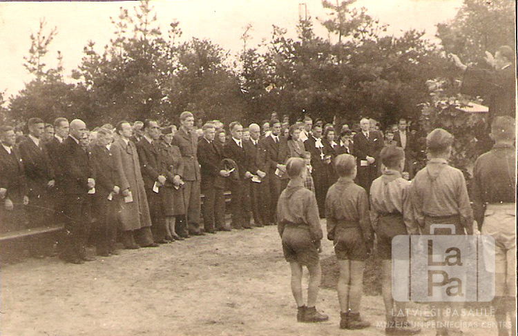 Dievkalpojums karoga laukumā Saules nometnē Gēsthahtā (angļu zonā). Kreisajā pusē cilvēki stāv mēteļos. Labajā pusē, priekšplānā, stāv skautu rinda formastērpos, ar mugurām pret fotogrāfu. Aiz skautu rindas uz paaugstinājuma stāv mācītājs ar paceltām rokām pret klausītājiem. Fonā mežs.