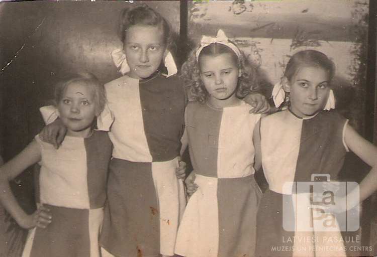 Četras jaunas meitenes stāv viena otrai blakus Saules nometnē Gēsthahtā (angļu zonā) ap 1947. gadu. Meitenes ģērbušās līdzīgās kleitās, ar lentēm matos. No kreisās: Rita Zemītis, Vita Vilnis, Rita Kambūts, Ināra Ošiņš.