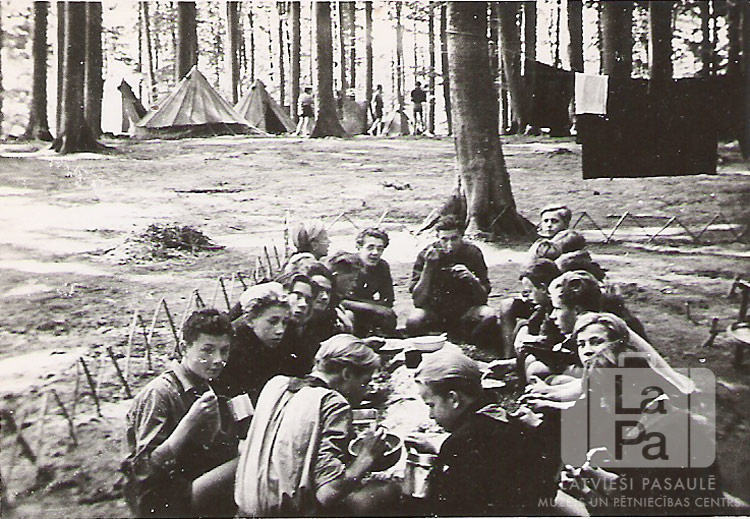 Abavas 6. skautu vienība no Saules nometnes Gēsthahtā (angļu zonā) ap 1947. gadu pusdieno mežā pie zemes galda. Fonā ir starp kokiem uz auklas izkārtas segas un uzslietas teltis. Kreisajā galda pusē, no kreisās: pirmais Uldis Kurzemnieks (ar krūzi rokās), otrais Otto Laitis, ceturtais Jānis Šneiders. Priekšā (ar muguru), no kreisās: pirmais Ivars Alberts, otrais Džēms Auns. Galda galā ir redzami: Harijs Laķis un Reinholds Niedra. Galda labajā pusē, no labās: trešais Juris Zemītis, pēdējais Dainis ?.