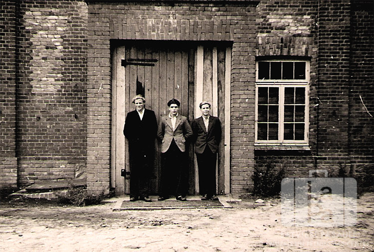 Trīs puiši stāv pie ģimnāzijas durvīm Saules nometnē Gēsthahtā (angļu zonā). Ķieģeļu ēka, lielas koka durvis, labajā pusē viens logs. No kreisās: Ēriks Šmits, Edgars Šuptiks un Juris Zemītis.