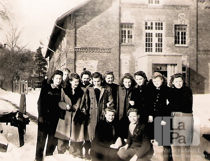 1. humanitārās klases skolēni Saules nometnē Gēsthahtā (angļu zonā) 1947. gada ziemā. Jaunieši ir ģērbušies ziemas drēbēs, uz zemes ir sniegs, fonā ir divstāvu ķieģeļu ēka. Priekšā, no kreisās: Rasma Kalniņa un Juris Zemītis. Aizmugurē stāv, no kreisās: Tatjāna ?, Ēriks Šmits, Biruta Broka, Austra Pērkone, Tusnelda Lācis, Aina ?, Gaida Vīlipa, Elita Gobiņa, Felicita Ancāns un Mirdza Eglīte.