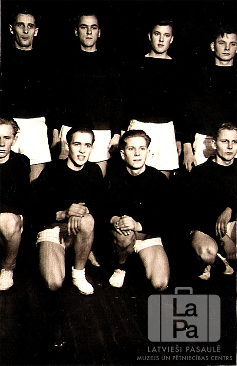 Vidusskolas vingrotāji sporta tērpos Neištatē (Holšteinā, angļu zonā). Divas rindas, četri puiši priekšā, četri puiši aizmugurē. Pirmajā rindā, no kreisās: Aivars Linde, Kārlis Riekstiņs, Juris Zemītis un Gunārs Jēkabsons. Otrajā rindā, no kreisās: Otis Ragainis, Linards Lukss (bijušais PBLA valdes priekšsēdis), Alfons Mednis un Visvaldis Reinfelds.