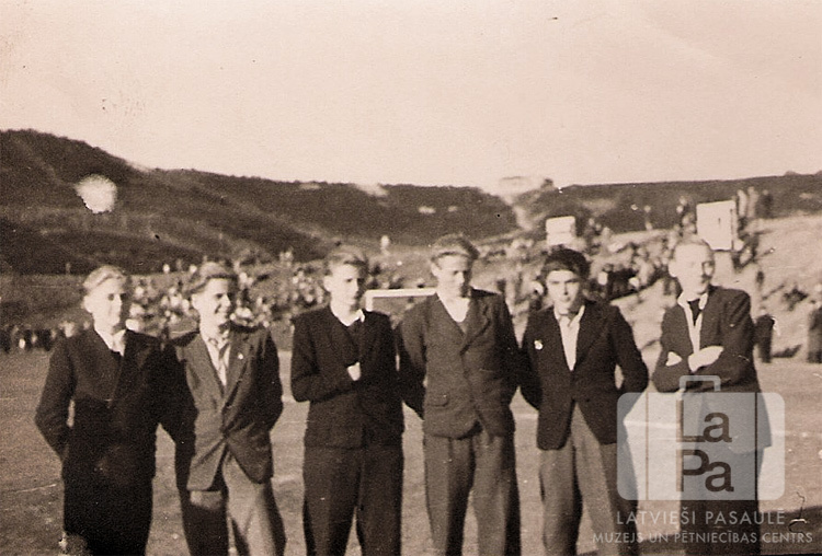 Jauniešu grupa no Saules nometnes Gēsthahtas pilsētas sporta laukumā (angļu zonā). Visi ir ģērbušies žaketēs. Fonā uz nogāzes sēž cilvēki. Tālumā pauguraina ainava. No kreisās: Pēteris Šmits, Juris Zemītis, Gunārs Jākobsons, Ēriks Šmits, Edgars Šupstiks un Ivars Gūtmanis.