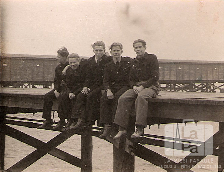 Zēnu grupa uz koka tilta peldētavā Neištatē (Holšteinā, angļu zonā). Fonā tilts ar garu, zemu koka ēku visā tā garumā. No kreisās: Jānis Šneiders, Vilis Celmiņš, Imants Balodis, Gunārs Jēkabsons un Juris Zemītis. Par šo gadījumu Juris Zemītis atceras: "Tas bija ap februāri, martu, tā kā uz ūdeni varējām tikai skatīties... CCG vidusskolā mums gāja labi. Dzīvojām internātā, zēni vienā mājā, meitenes otrā. Biju 3. ģimnāzijas klasē, 16. gadus vecs. Meitenes un sports bija ļoti svarīga dzīves sastāvdaļa, diemžēl bija arī jāmācās."