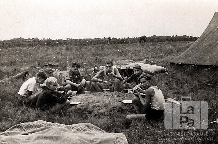 Pūču kops ietur maltīti skautu sagatavošanas nometnē Pinnebergā (angļu zonā). Jaunieši sēž aplī ap zemē izraktu galdu. Labajā pusē ir telts. Fonā, vidū, stāv cilvēks, tam labajā pusē ganās zirgs. Par šo gadījumu Juris Zemītis atceras: "1947. gadā Francijā notika pasaules skautu "Jamboree de la Paix" (Miera džamboreja), kurā piedalījās 3 latviešu skautu vienības no Vācijas angļu zonas, franču zonas un amerikāņu zonas, kā arī latviešu skauti no Zviedrijas un Francijas. Angļu zonas skauti sapulcējās Pinnebergas nometnē, kur notika sagatavošanās nometne. Lai būtu treniņš, uzcēlām vārtus, nojaucām vārtus, sapakojām teltis un atkal uzcēlām, mācījāmies franču valodu. Līdz vienā dienā pēkšņi teltis vairs nebija jāceļ par jaunu, un bijām dzelzceļa vagonos, kurus pievienoja sastāvam, kas nāca no Dānijas. Mums visiem tas bija milzīgs pārdzīvojums. Visi tie skauti un no visām pasaules malām."