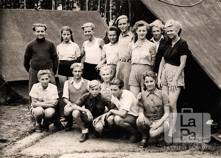 Jauniešu grupa no Saules nometnes Gēsthahtā (angļu zonā) organizācijas "YMCA" vasaras nometnē Timmendorfā. Fonā ir divas uzslietas teltis un mežs.