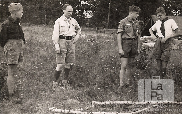 Trīs skauti un skautu priekšnieks formastērpos stāv pļavā skautu sagatavošanas nometnē Pinnebergā (angļu zonā). Priekšplānā uz zemes guļ bērza koka mieti. Fonā, labajā pusē, ir uzslieta telts, aizmugurē mežs. No kreisās: nezināms, E. Dunsdorfs (profesors, skautu priekšnieks), (?) Kaņepe, (?) Freivalds.