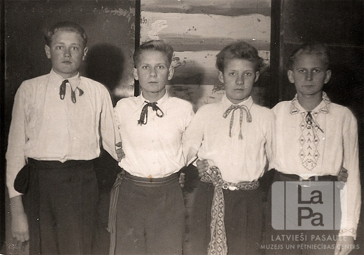 Četri tautas deju dejotāji stāv viens otram blakus Saules nometnē Gēsthahtā (angļu zonā). Zēni stāv gaišos kreklos ar prievītēm ap kaklu. No kreisās: Ēriks Šmits, Juris Zemītis, Visvaldis Mucenieks, Gunārs Jākobsons.