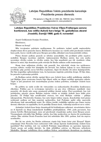 Latvijas Republikas Prezidentes Vairas Vīķes-Freibergas uzruna konferencē, kas veltīta Aukstā kara beigu 10. gadadienas atcerei Jivaskilā, Somijā 1999. gada 8. novembrī