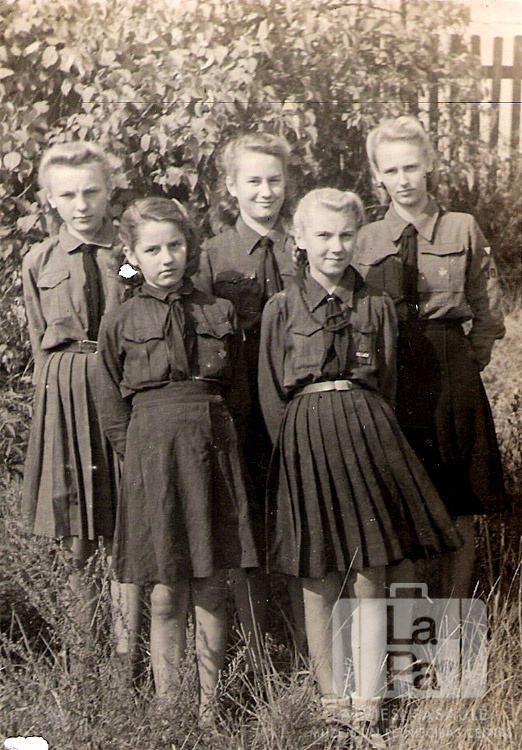 Bezdelīgu kops formastērpos Saules nometnē Gēsthahtā (angļu zonā) ap 1947. gadu. Meitenes stāv zālē, fonā krūms un žogs. Priekšā, no kreisās: Inta Pavloska un Ināra Ošiņa. Aizmugurē, no kreisās: Gaisma Kovala, Ruta ? un Zaiga Sproģe.
