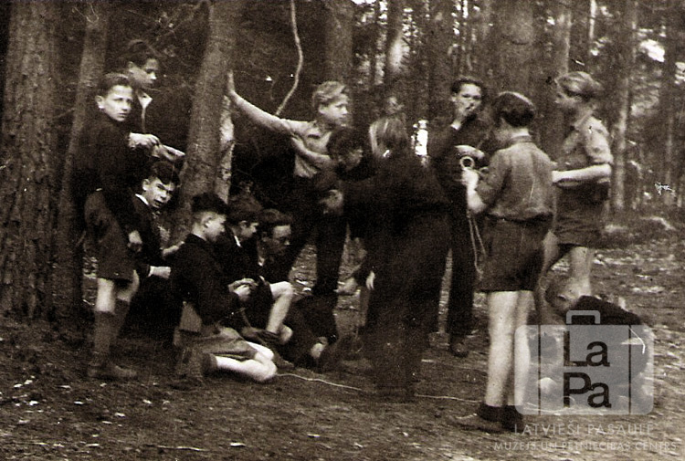 Abavas 6. skautu vienības zēni no Saules nometnes Gēsthahtā (angļu zonā) skautu šķēršļu gājiena laikā mežā. Visi zēni ir ģērbušies skautu formastērpos, stāv pie kokiem un aktīvi sarunājas.