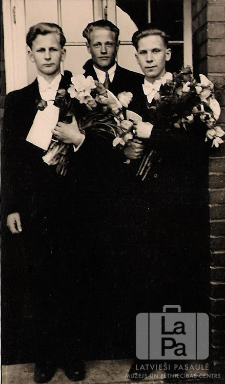 Trīs puiši savās iesvētībās Saules nometnē Gēsthahtā (angļu zonā) 1949. gada Lieldienās. Puiši ir ģērbušies uzvalkos, visiem rokās ir ziedi un dokumenti. Fonā durvis/ logs, labajā pusē ķieģeļu siena. No kreisās: Gunārs Jakobsons, Ēriks Šmits, Juris Zemītis.