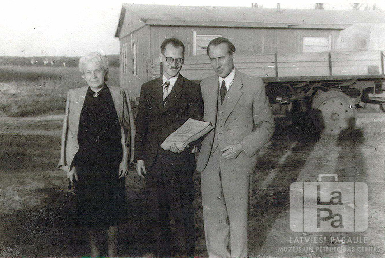 Trīs cilvēki ar Vēdeles nometnes (angļu zonā) avīzes “Atbalss” pirmo izdevumu. Fonā piekabe, vienstāvu koka baraka un plašs lauks. No kreisās: Marta Torokova, Teodors Torokovs, Edgars Lange (mācītājs).