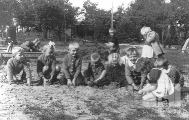 Bērnudārza bērni spēlējas smiltīs Vēdeles nometnē (angļu zonā). Fonā kreisajā pusē ir smilšu kaste, aizmugurē ir koki un vienstāvu ēka.