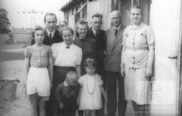 Cilvēku grupa ar diviem bērniem pie vienstāvu ēkas Riekstiņu Vijas kristībās Vēdeles nometnē (angļu zonā). Fonā elektrības līnija un plašs lauks. Priekšā, no kreisās: Andris Lange un Laima Lange (pr. Urdze). Otrajā rindā, no kreisās: Irēne-Anete Redlicha, Lilija Lange, ? Riekstiņa, ? Riekstiņš, ? Labējs, ? Labēja. Trešajā rindā: Edgars Lange (mācītājs).