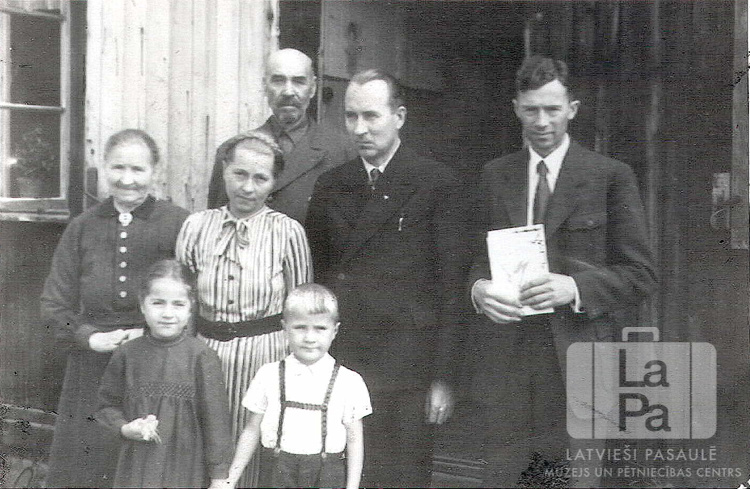 9. barakas iedzīvotāji stāv pie savas barakas ieejas Vēdeles nometnē (angļu zonā). Fonā kreisajā pusē ir logs ar puķu podu. Priekšā, no kreisās: Laima Lange (pr. Urdze), Andris Lange. Otrajā rindā, no kreisās: Malvīne Lange, Lilija Lange, Edgars Lange (mācītājs), Arnolds Ernstsons (mācītājs). Aizmugurē stāv Pēteris Lange.