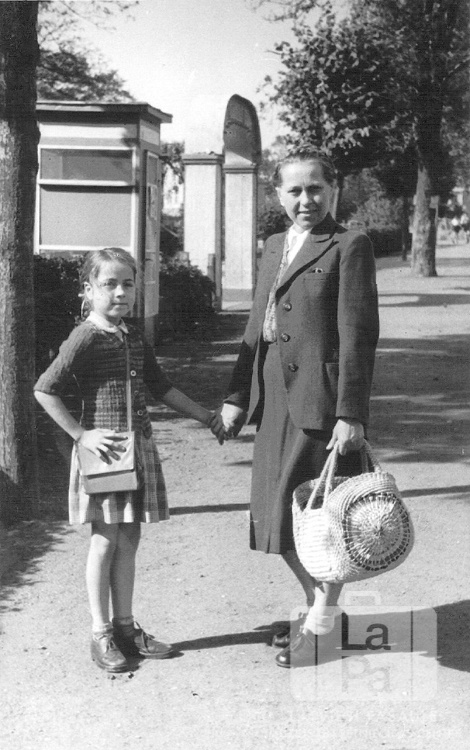 Lilija Lange ar meitu Laimu stāv uz ielas atceļā uz nometni Lībekā (angļu zonā) 1949. gada vasarā. Sievietei rokā ir liela soma, meitenei pār plecu ir maza rokassoma. Fonā ir neliela būda un mūra vārti. No kreisās: Laima Lange (pr. Urdze), Lilija Lange.