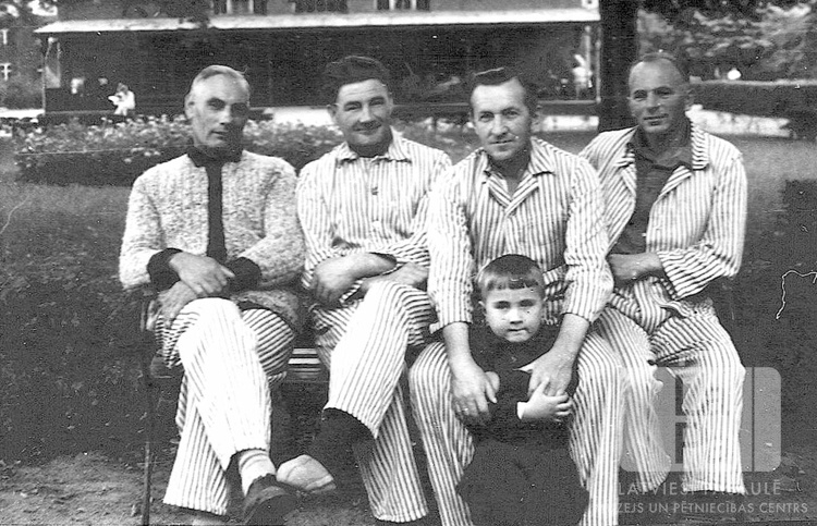 Slimnīcas latviešu nodaļas pacienti Lībekā (angļu zonā). Priekšā vienam starp kājām sēž mazs zēns, aizmugurē četri vīrieši strīpainās drēbēs sēž uz sola. Fonā ir apstādījumi un ēka. Priekšā: Andris Lange. Aizmugurē, no kreisās: ? Sīlis, ? Akmentiņš, ? Andersons, ? Kornerts.