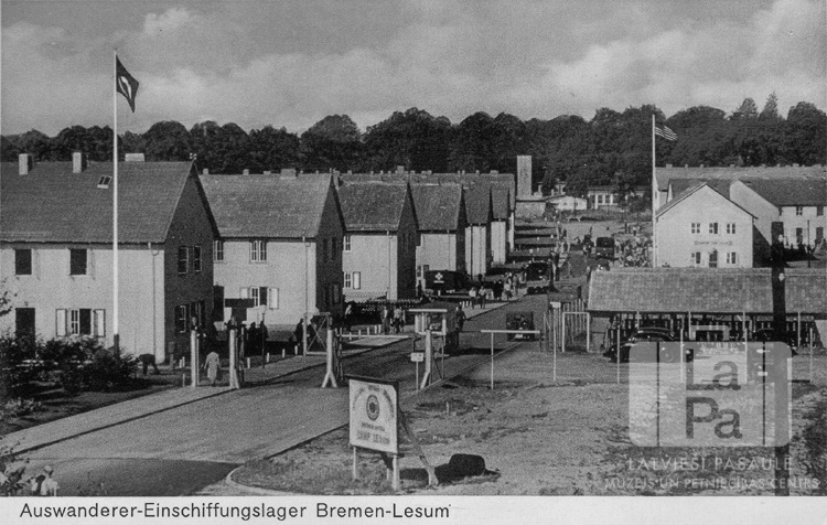 Iela un divstāvu baraku rindas Brēmenes izceļošanas nometnē (amerikāņu zonā). Šī nometne atradās pilsētas Lesumas rajonā. Priekšplānā ielas malā ir nometnes zīme. Redzami nometnes vārti, pa ielu pārvietojas automašīnas un gājēji. Nometnē ir divi plīvojoši karogi mastos. Fotogrāfijas apakšā paraksts: "Auswanderer-Einschiffungslager Bremen-Lesum."