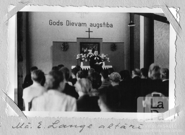 Svētdienas skolas svētku dievkalpojums Čērčila nometnē Lībekā (angļu zonā). Priekšā sēž cilvēki uz krēsliem, telpas galā altāra priekšā stāv mācītājs amata tērpā un atvērtu grāmatu rokās. Uz altāra ir ziedi vāzēs, virs tā uz sienas ir krusts un vārdi: "Gods Dievam augstībā". Pie altāra stāv: Edgars Lange.
