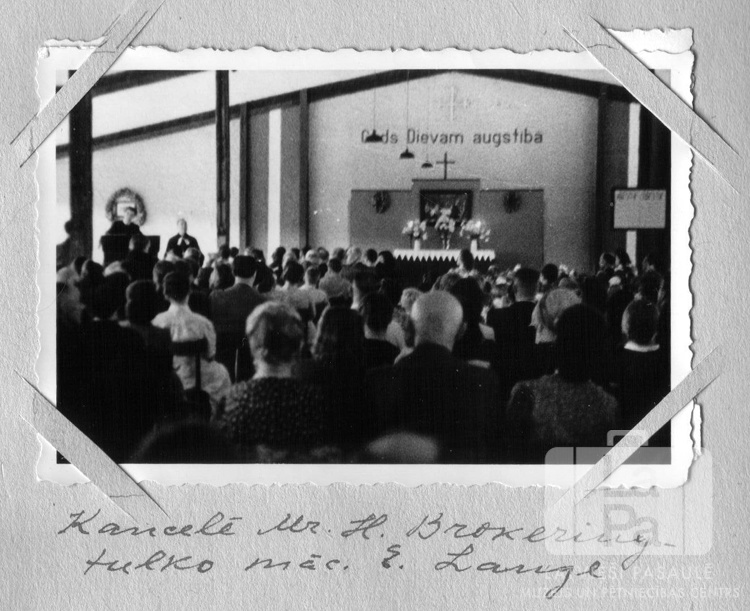 Svētdienas skolas svētku dievkalpojums Čērčila nometnē Lībekā (angļu zonā). Cilvēki sēž uz krēsliem, telpas galā, kreisajā stūrī, pie kanceles stāv divi mācītāji amata tērpos. Uz altāra ir ziedi vāzēs, virs tā uz sienas ir krusts un vārdi: "Gods Dievam augstībā". Daļa no albuma, kas bija bija dāvana Edgaram Langem no Čērčila nometnes draudzes. Pie kanceles stāv, no kreisās: pirmais Herberts Brokerings (sprediķo), otrais Edgars Lange (tulko).