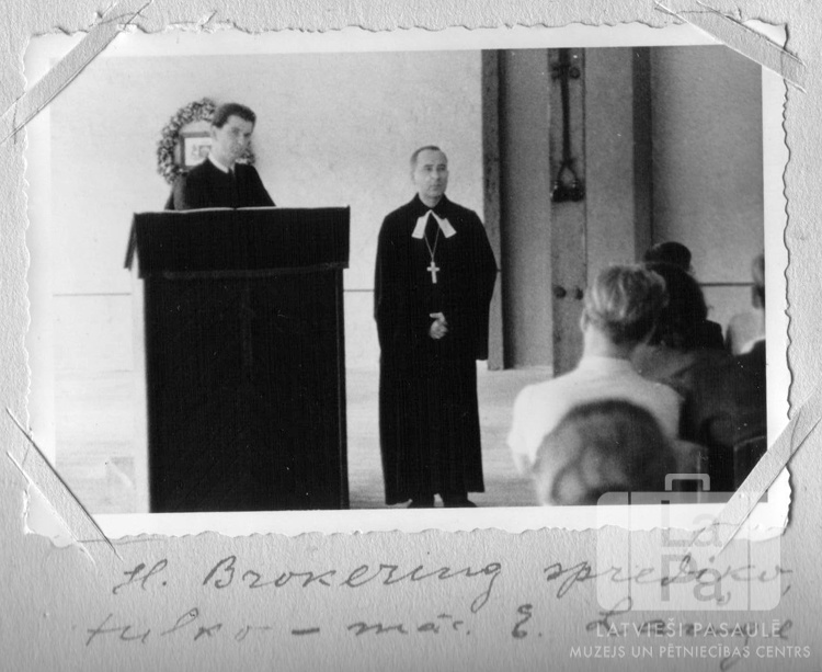 Divi mācītāji amata tērpos pie kanceles svētdienas skolas svētku dievkalpojumā Čērčila nometnē Lībekā (angļu zonā). Priekšā, labajā pusē, ir apmeklētāju muguras. Daļa no albuma, kas bija bija dāvana Edgaram Langem no Čērčila nometnes draudzes. Pie kanceles stāv, no kreisās: pirmais Herberts Brokerings (sprediķo), otrais Edgars Lange (tulko).