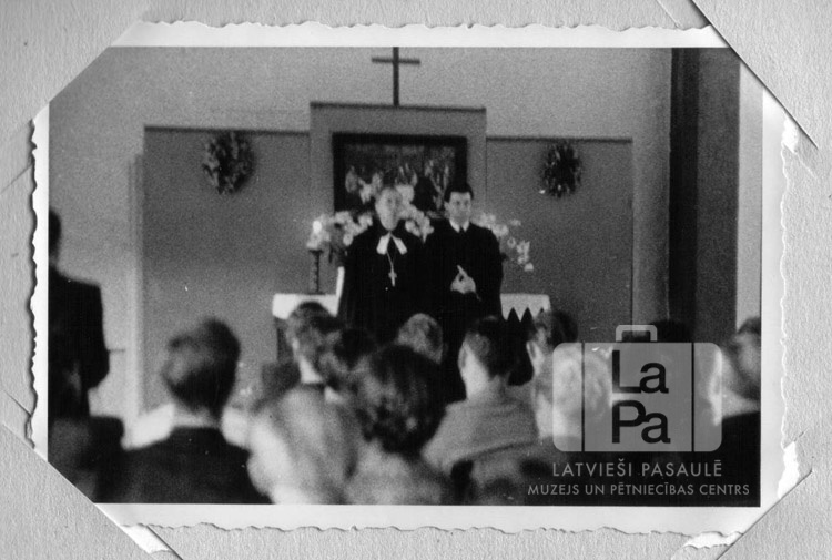 Divi mācītāji amata tērpos altāra priekšā svētdienas skolas svētku dievkalpojumā, beigu liturģijas laikā, Čērčila nometnē Lībekā (angļu zonā). Priekšā ir apmeklētāju muguras, virs altāra ir krusts. Attēls ir daļa no albuma, ko Čērčila nometnes draudze dāvināja mācītājam Edgaram Langem. Pie altāra stāv, no kreisās: pirmais Edgars Lange (tulko), otrais Herberts Brokerings (sprediķo).