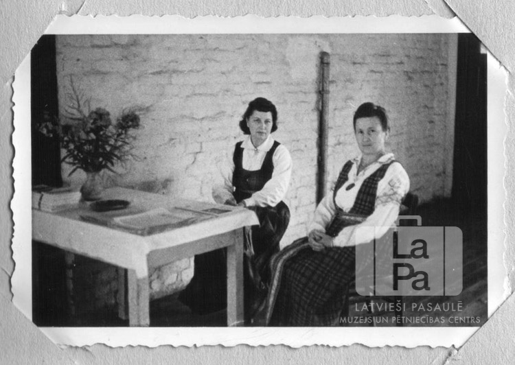 Divas dāmu komitejas locekles tautastērpos sēž pie grāmatu galda Čērčila nometnes baznīcā Lībekā (angļu zonā), svētdienas skolas svētku dievkalpojuma laikā. Uz galda ir novietotas grāmatas un puķes vāzēs. No kreisās: ? Petrītis un ? Freimanis.