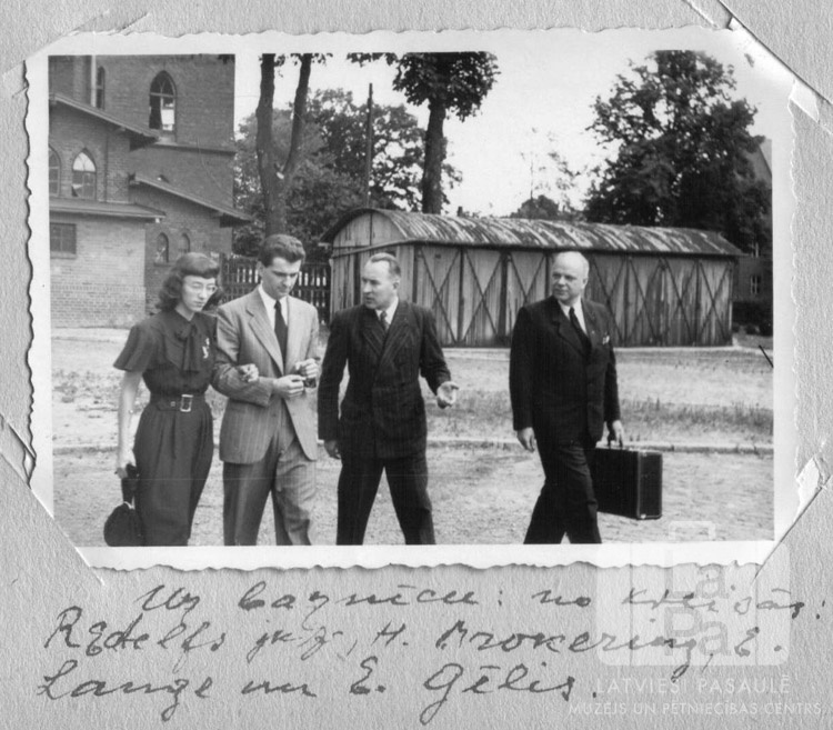 Trīs vīrieši un viena sieviete pa ceļam uz baznīcu Čērčila nometnē Lībekā (angļu zonā). Fonā ir laukums un vairākstāvu mūra ēka kreisajā pusē, bet zema vienstāvu celtne labajā pusē. Daļa no albuma, kas bija bija dāvana Edgaram Langem no Čērčila nometnes draudzes. No kreisās: ? Redelfs (?), Herberts Brokerings, Edgars Lange (mācītājs) un E. Gīlis.
