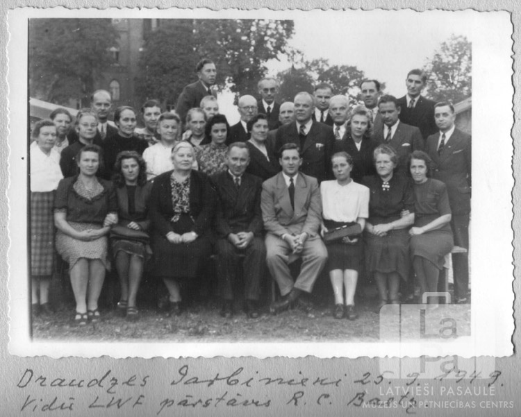 Draudzes darbinieku grupa draudzes sanāksmes laikā Čērčila nometnē Lībekā (angļu zonā). Priekšējās divas rindas sēž uz krēsliem, aizmugurē cilvēki stāv kājās. Pirmajā rindā sēž, no kreisās: ceturtais Edgars Lange (mācītājs), piektais R. C. Baetz (Pasaules luterāņu federācijas pārstāvis).
