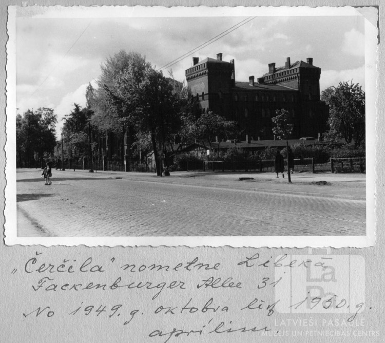 Ielas skats uz vairākstāvu mūra ēku Čērčila nometnē Lībekā (angļu zonā), no 1949. gada oktobra līdz 1950. gada aprīlim. Ēkai ir divi zemi torņi. Ēkas adrese: "Fackenburger Allee 31". Priekšplānā ir bruģēta iela, pa kuru pastaigājas pāris cilvēki. Ielas malā ir koku rinda.
