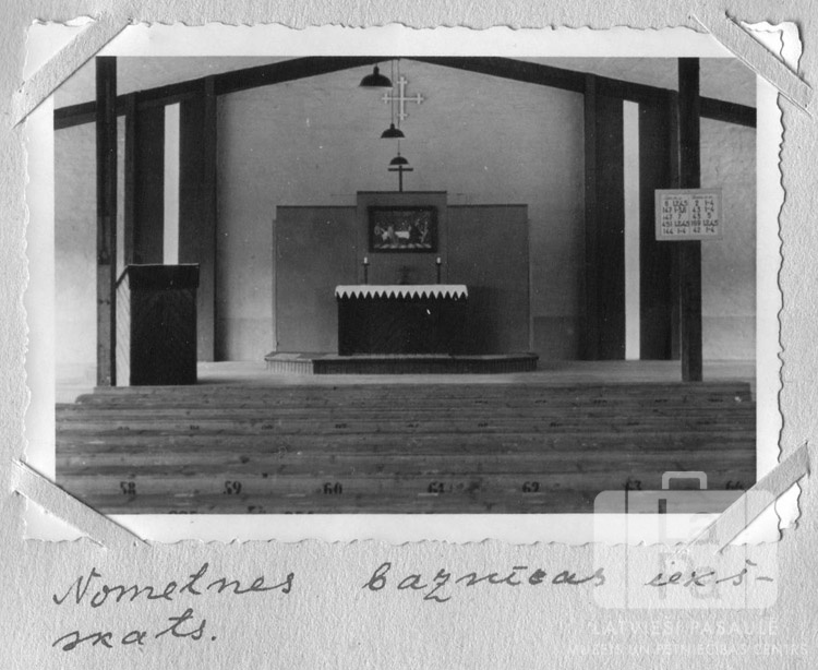 Baznīcas iekšskats Čērčila nometnē Lībekā (angļu zonā). Priekšplānā ir koka solu rindas, telpas galā ir altāris, uz kura ir divi svečturi. Virs altāra karājas glezna. Abās altāra pusēs ir Latvijas valsts karogi. Telpā ir redzami koka balsti; pie balsta kreisajā pusē atrodas kancele.