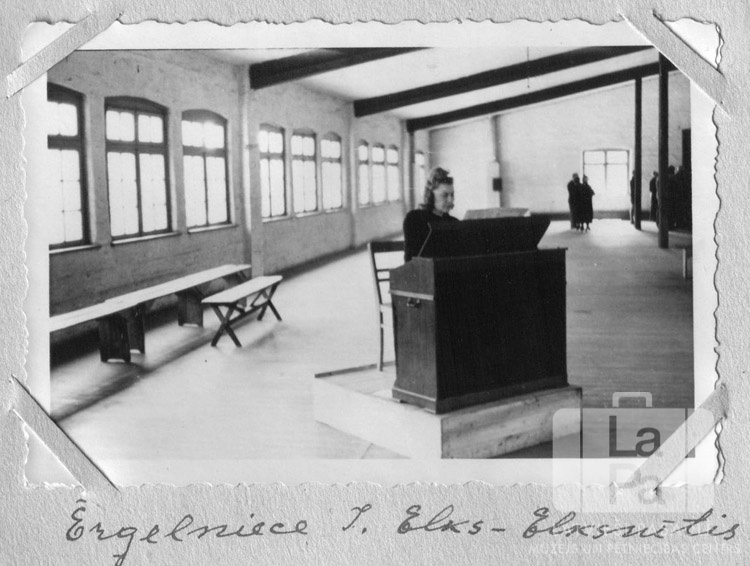 Ērģelniece Ina Elks-Elksnītis sēž pie ērģelēm Lībekā (angļu zonā). Telpas kreisajā pusē ir gara logu rinda. Telpas galā ir neliela cilvēku grupa.