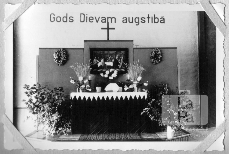 Altāris pļaujas svētku rotā Čērčila nometnē Lībekā (angļu zonā). Uz altāra ir ziedi, divas sveces, citi priekšmeti; virs altāra uz sienas ir glezna, koka krusts un uzraksts "Gods Dievam augstībā" . Pie altāra uz grīdas ir divas lielas vāzes ar meijām.