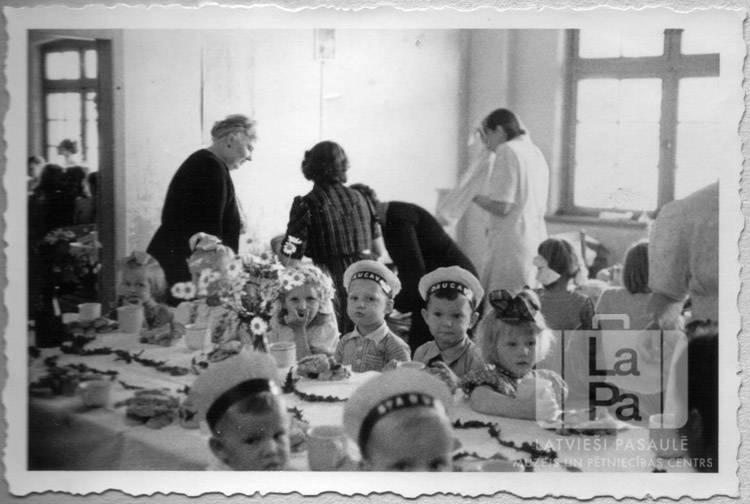 Mazi bērni sēž pie gariem, klātiem galdiem svētdienas skolas svētkos Čērčila nometnē Lībekā (angļu zonā). Uz galdiem ir trauki, ēdienu šķīvji un ziedi vāzēs. Bērniem ir vienādas cepures. Starp galdiem staigā pieaugušie.