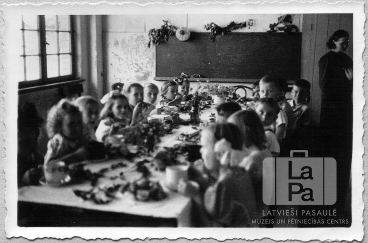 Mazi bērni sēž pie klāta galda svētdienas skolas svētkos Čērčila nometnē Lībekā (angļu zonā). Uz galdiem ir trauki, ēdienu šķīvji un ziedi vāzēs. Fonā kreisajā pusē ir logs. Telpas galā ir izpušķota tāfele, tai labajā pusē stāv sieviete.