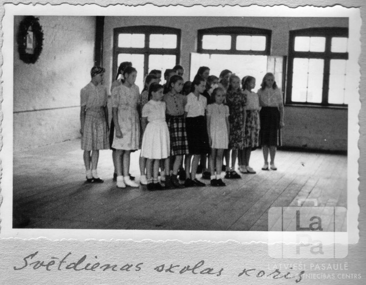 Svētdienas skolas koris dzied dievkalpojumā Čērčila nometnē Lībekā (angļu zonā). Meitenes sastājušās trijās rindās. Vienkāršs telpas iekārtojums – dēļu grīda, kreisajā pusē ir ķieģeļu siena ar nelielu attēlu un vainagu uz tā. Fonā ir logu rinda.