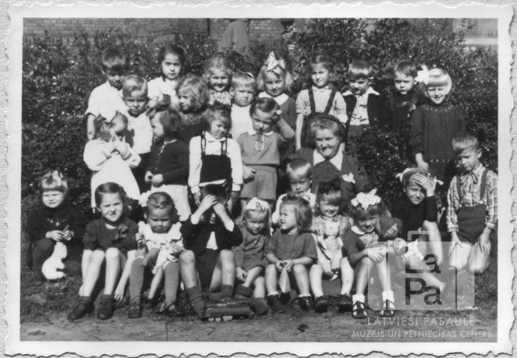 Bērnudārza bērni ar vadītāju svētdienas skolas svētkos Čērčila nometnē (Lībekā). Fonā ir krūmājs. Grupas vidū ir redzama vadītāja Z. Kalnājs.